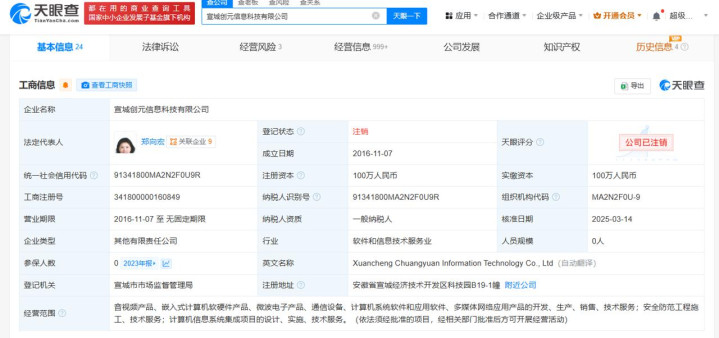 天眼查App显示,近日,宣城创元信息科技有限公司企业状态由存续变更为注销。