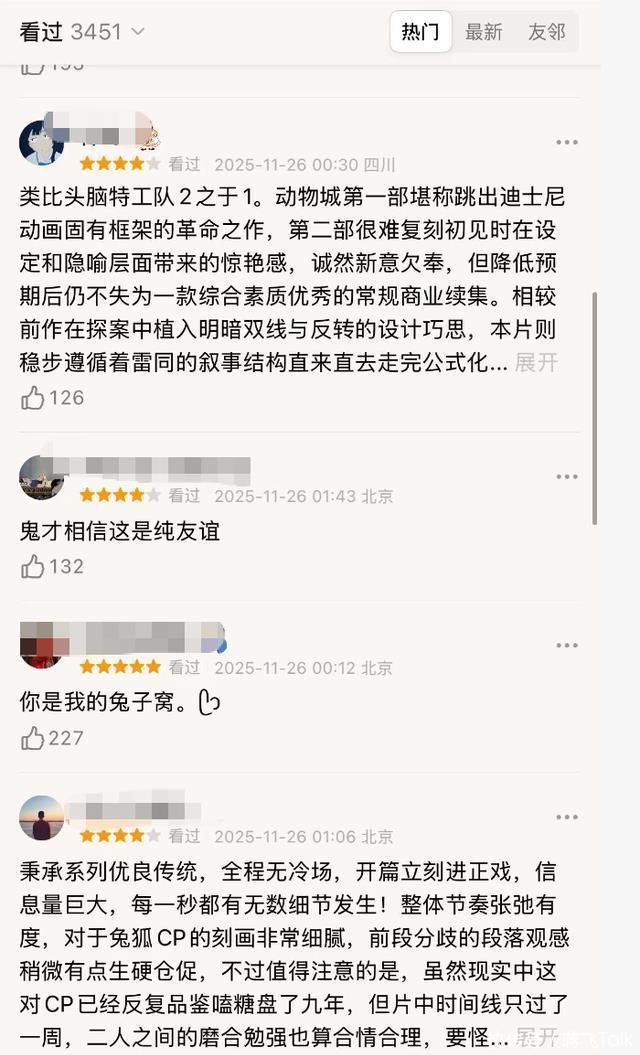 相信不少人都在凌晨的12点排队去了电影院看了首映,电影的口碑到底如何呢,目前,口碑已经新鲜出炉了,看看是不是你熟悉的那个“兔子狐狸”呢。 总体来说,电影的口碑算是 稳住了,在高赞评论区域,有其个别的差评,但是大部分人都给出了4星到5星。 参考第一部9.3分的好成绩,个人预测第二部可能会比第一部稍微低一些,但是上8.5分应该是比较稳的。