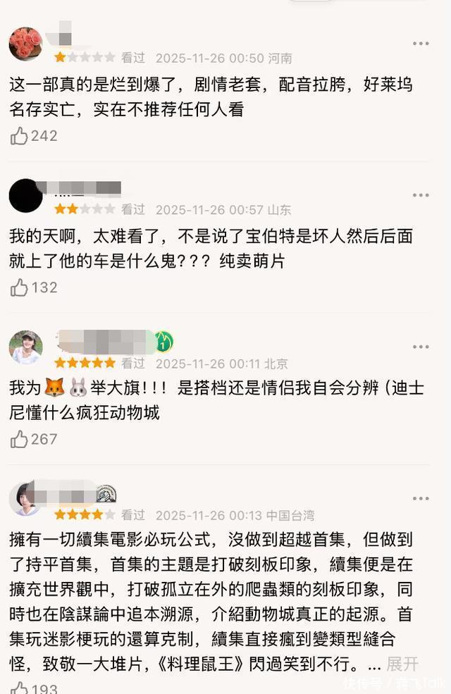 给差评的观众,认为该片的问题是剧情老套,配音拉胯。 其实这个也是意料之中的,这几年的好莱坞大片,大部分都是换汤不换药的,还包含了很多ZZZQ的内容,让不少的观众们嗤之以鼻。 《疯狂动物城》是迪士尼口碑最炸的IP之一了,观众们之所以相当喜欢第一部,除了迪士尼的制作水平之外,还有不少能够让打工人共情的点,比如打破偏见,比如小人物的逆袭和成长等等。 如果第二部偏离了这些主题,评分必然会下降,高赞评论一针见血。 不过,冲着25亿的预测成绩,该片已经是金字招牌了,这个冬季,都被尼克和朱迪感动了(不过这次好像有蛇,有网友怕蛇有点不敢去)。 你买好票了吗,期待该片吗。